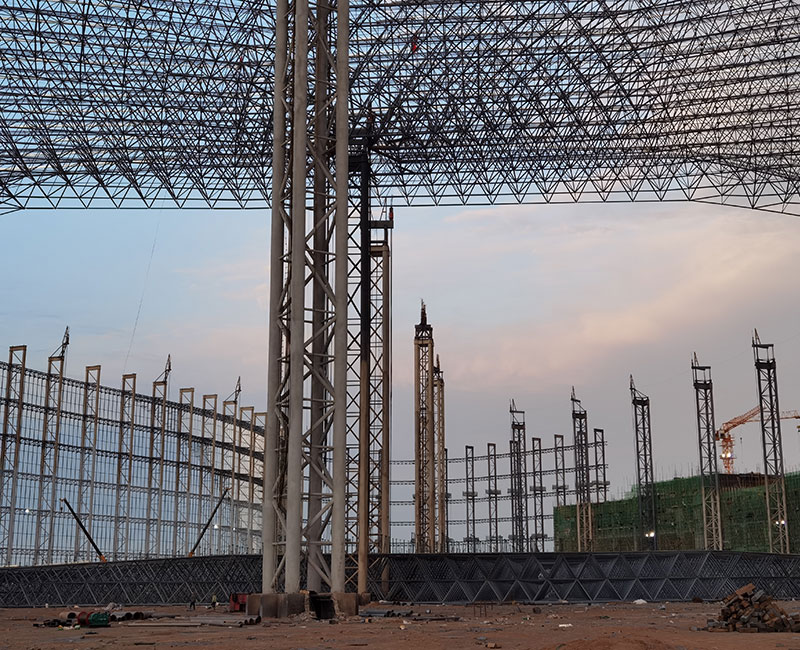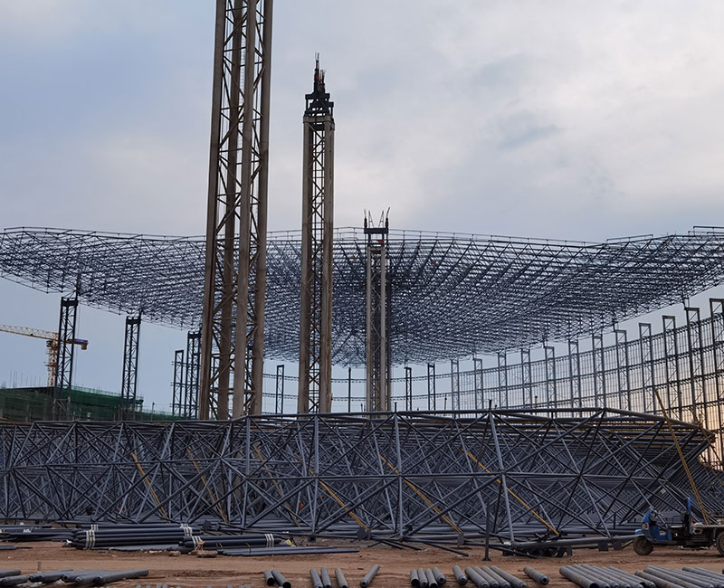 網(wǎng)架是由多根桿件按照一定的網(wǎng)格形式通過節(jié)點(diǎn)連結(jié)而成的空間結(jié)構(gòu)。構(gòu)成網(wǎng)架的基本單元有三角錐,三棱體,正方體,截頭四角錐等。這些基本單元可組合成平面形狀的三邊形,四邊形,六邊形,圓形或其他任何形體。具有空間受力、重量輕、剛度大、抗震性能好等優(yōu)點(diǎn);可用作體育館、 影劇院、展覽廳、候車廳、體育場(chǎng)看臺(tái)雨篷、飛機(jī)庫、雙向大柱網(wǎng)架結(jié)構(gòu)距車間等建筑的屋蓋。缺點(diǎn)是匯交于節(jié)點(diǎn)上的桿件數(shù)量較多,制作安裝較平面結(jié)構(gòu)復(fù)雜。